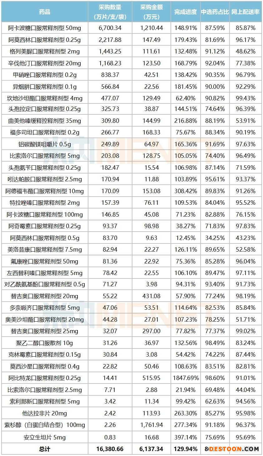 從采購數(shù)量來看,32個藥品的36個品規(guī)在全省12個聯(lián)盟地區(qū)采購總數(shù)量為16380.66萬片/支/袋;按藥品統(tǒng)計,最高為阿卡波糖50mg的6700.34萬粒,最低為安立生坦5mg的0.83萬片。阿卡波糖在江西中標(biāo)的企業(yè)為拜耳,安立生坦中標(biāo)企業(yè)為華海藥業(yè)。