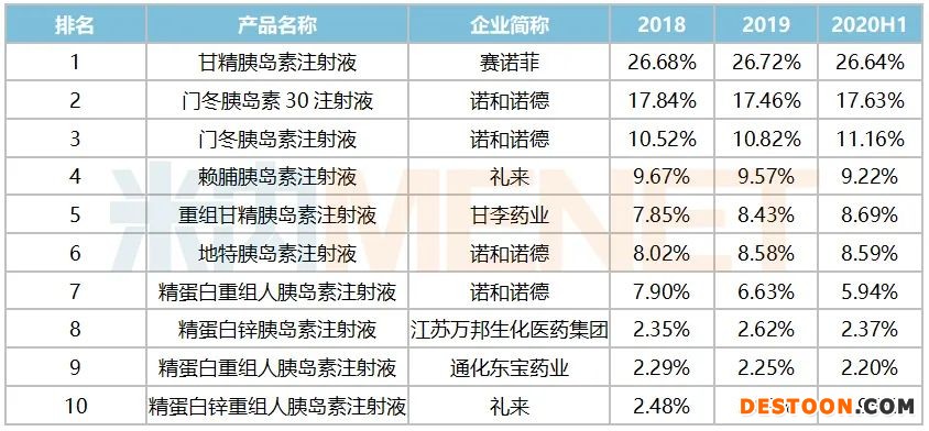 甘精胰島素、門冬胰島素、賴脯胰島素是重點省市公立醫(yī)院終端胰島素及其類似藥TOP3品種,2020年上半年合計市場份額超過74%。