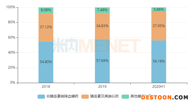 米內(nèi)網(wǎng)數(shù)據(jù)顯示,最近幾年在重點省市公立醫(yī)院終端,非胰島素類降血糖藥依然是糖尿病用藥的主力,但胰島素及類似藥的市場份額也在逐漸上漲。2020上半年受疫情影響,患者到醫(yī)院就診的頻率下滑,但該小類的市場份額依然樂觀,占比上漲至38%左右。