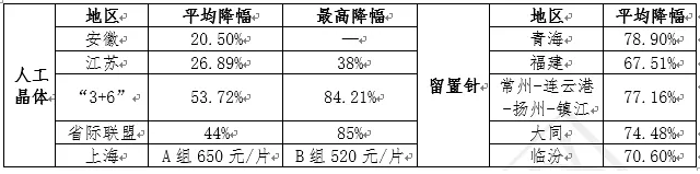 目前,人工晶體已進(jìn)行6輪帶量談判(安徽、江蘇、“3+6”、省際聯(lián)盟、曲靖、上海),留置針作為低值耗材,在省級(jí)和市級(jí)帶量采購(gòu)中都有出現(xiàn),共計(jì)18次(包含本次)。在已公布降幅的結(jié)果中,人工晶體最高降幅達(dá)85%,為省際聯(lián)盟項(xiàng)目,留置針平均降幅最高值為78.9%,為青海省級(jí)項(xiàng)目。