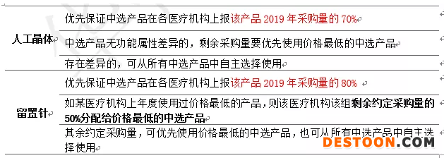 《意見(jiàn)稿》指出,人工晶體和留置針約定采購(gòu)量分別根據(jù)醫(yī)療機(jī)構(gòu)上報(bào)上年度總采購(gòu)量70%、80%確定,并保證中選產(chǎn)品原有采購(gòu)份額一定比例的采購(gòu)量,剩余采購(gòu)量?jī)?yōu)先使用按價(jià)格較低的產(chǎn)品,具體分配標(biāo)準(zhǔn)如下: