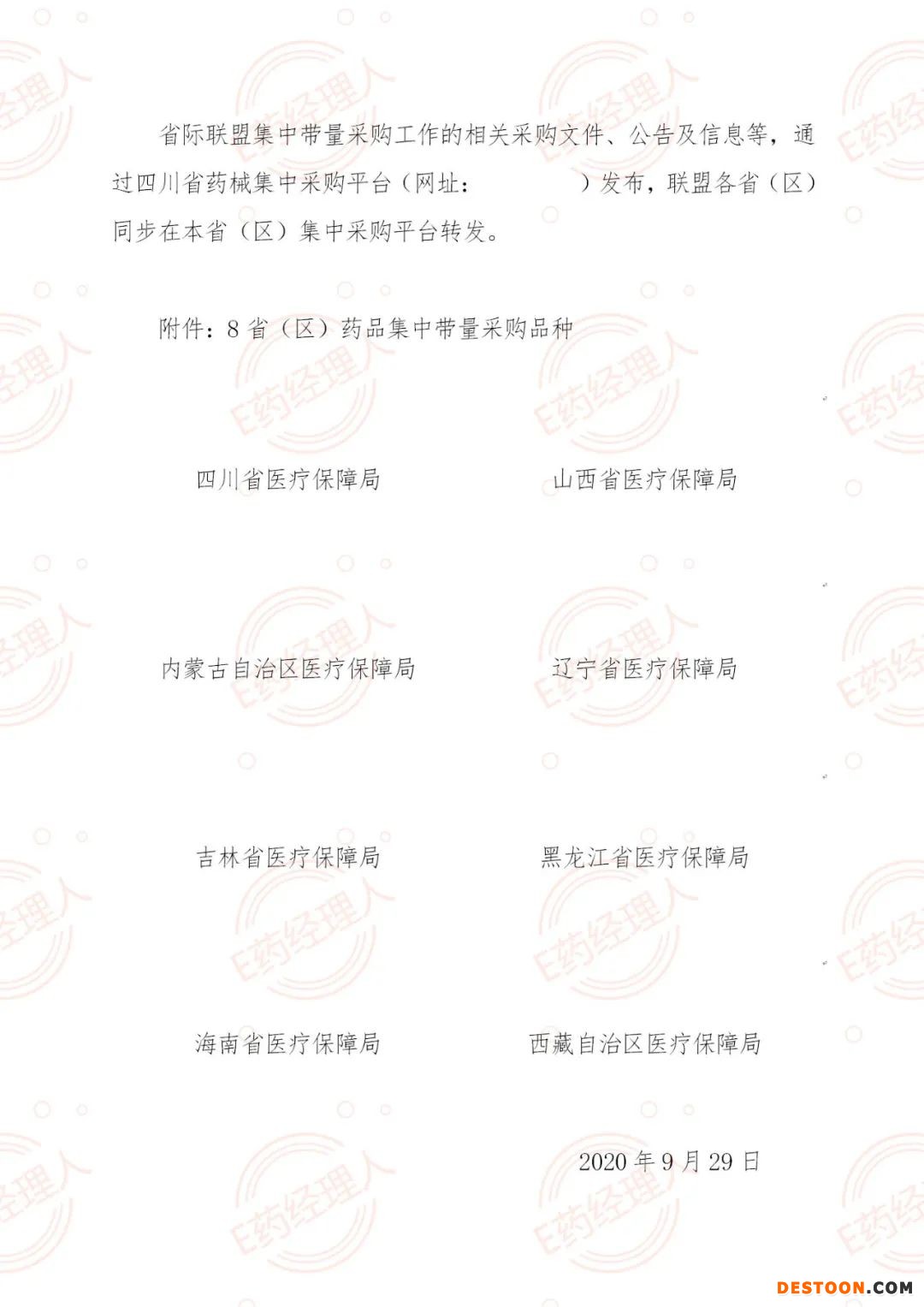 10月9日訊 9月29日,E藥經(jīng)理人從業(yè)內(nèi)獲得一份名為《8省區(qū)開展省際聯(lián)盟藥品集中帶量采購(gòu)工作的公告》,該公告落款為四川、山西、遼寧、吉林等8省區(qū)的醫(yī)保局,落款日期為9月29日。
