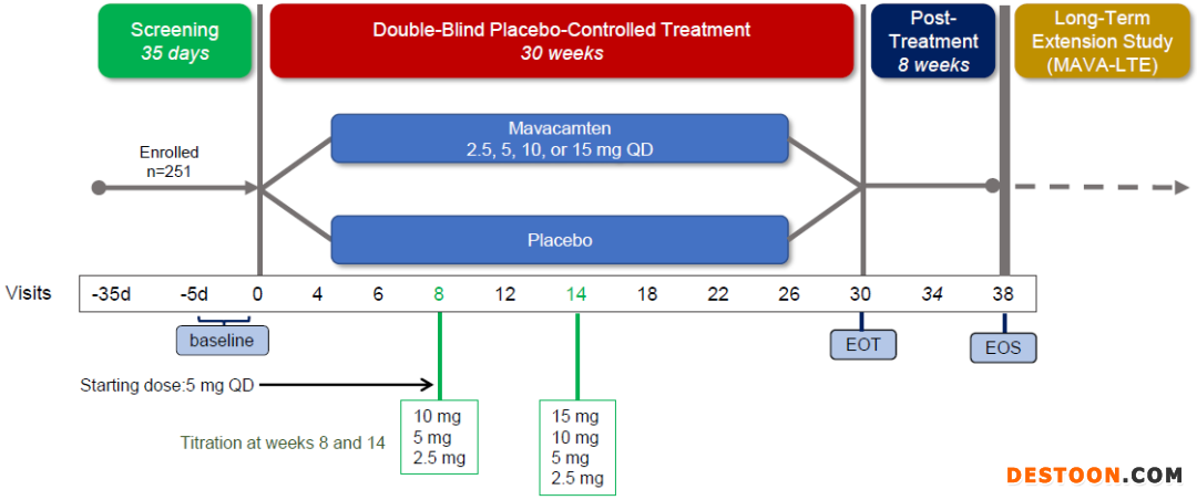 在今年8月的歐洲心臟病學(xué)會(huì)大會(huì)(ESC Congress)上,MyoKardia公布了mavacamten的關(guān)鍵性III期臨床試驗(yàn)EXPLORER-HCM(NCT03470545)30周的結(jié)果。251例有癥狀梗阻性HCM患者被1:1隨機(jī)分成兩組,在30周內(nèi)每日口服一次mavacamten或安慰劑。全部患者滿足以下入排標(biāo)準(zhǔn):LVOT梯度≥50mmHg、NYHAclass II-III(紐約心臟協(xié)會(huì)II-III級(jí))癥狀、LVEF(左心室射血分?jǐn)?shù))>55%,允許背景用藥。患者最初每天接受5mg的劑量,在第8周和第14周有兩次機(jī)會(huì)根據(jù)心臟健康的血藥濃度測(cè)量將劑量調(diào)整到2.5mg和15mg之間。(圖表4)