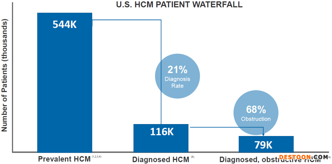 BMS的CEO Giovanni Caforio在電話會(huì)議上,堅(jiān)稱僅憑mavacamten在梗阻性HCM方面的前景,即可證明收購(gòu)MyoKardia是合理的。Caforio博士認(rèn)為梗阻性HCM適應(yīng)癥是一個(gè)“幾十億美元的機(jī)會(huì)”。每500人中就有1人患有HCM,使其成為最常見(jiàn)的遺傳性心血管疾病。在美國(guó)和歐盟,目前約有16-20萬(wàn)人被診斷為有癥狀的梗阻性HCM,據(jù)估計(jì)只有約25%的梗阻性HCM患者和約10%的非梗阻性HCM患者得到了診斷。以美國(guó)為例,估計(jì)HCM患者有54.4萬(wàn)例,但是診斷率僅有21%??梢灶A(yù)見(jiàn),隨著診斷率的提升,HCM治療市場(chǎng)的容量將會(huì)進(jìn)一步增長(zhǎng)。(圖表3)