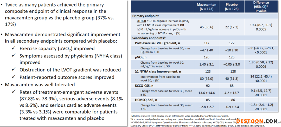 試驗(yàn)結(jié)果顯示,36.6%的隨機(jī)接受mavacamten治療的患者達(dá)到主要終點(diǎn),相比之下,接受安慰劑的患者只有17.2%,且統(tǒng)計(jì)學(xué)差異顯著(p=0.0005)。Mavacamten治療的患者在癥狀、功能狀態(tài)和生活質(zhì)量的關(guān)鍵方面,均有統(tǒng)計(jì)學(xué)意義和臨床意義的改善,體現(xiàn)為運(yùn)動(dòng)能力(pVO2,峰值耗氧量)改善、NYHA級(jí)別改善、LVOT阻塞梯度減少,以及患者報(bào)告結(jié)果分?jǐn)?shù)改善,如KCCQ-CSS(堪薩斯市心肌病問(wèn)卷-臨床總結(jié)評(píng)分)和HCMSQ-SoB(HCM癥狀問(wèn)卷呼吸急促子評(píng)分)。除了滿足主要和全部次要終點(diǎn)外,mavacamten的耐受性良好,安全性與安慰劑相似。(圖表5)
