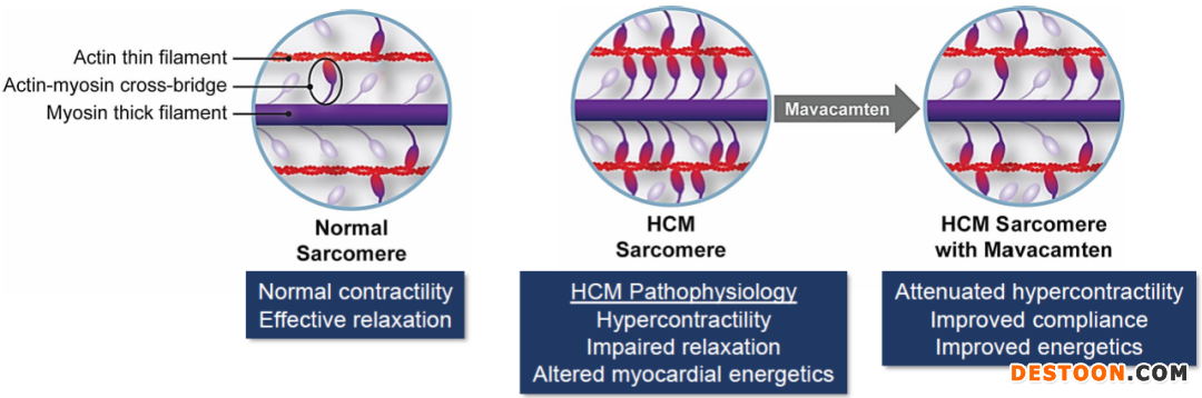 Mavacamten是一類新的直接肌球蛋白抑制劑(myosininhibitor)的首個(gè)候選藥物,它針對(duì)過(guò)度收縮和松弛受損、心肌能量和順應(yīng)性,旨在治療肥厚性心肌?。℉CM,hypertrophic cardiomyopathy)。MyoKardia已經(jīng)將mavacamten推進(jìn)至多項(xiàng)后期臨床研究,觀察其治療梗阻性和非梗阻性HCM的潛力。