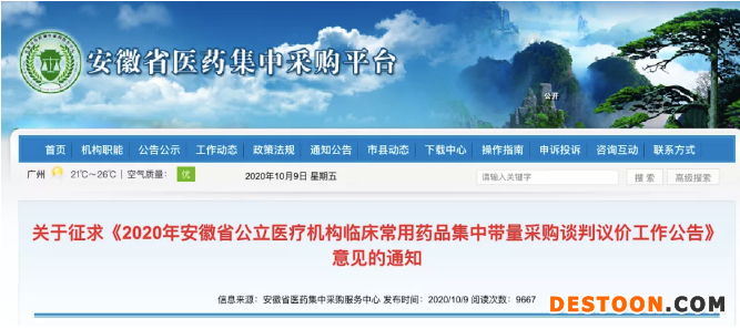 10月9日,安徽省醫(yī)藥集中采購平臺發(fā)布通知關(guān)征求《2020年安徽省公立醫(yī)療機(jī)構(gòu)臨床常用藥品集中帶量采購談判議價工作公告》的意見。