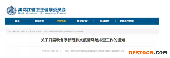 10月12日,黑龍江省應(yīng)對新型冠狀病毒感染肺炎疫情工作領(lǐng)導(dǎo)小組指揮部辦公室下發(fā)了《關(guān)于開展秋冬季新冠肺炎疫情風(fēng)險排查工作的通知》(以下簡稱《通知》)。