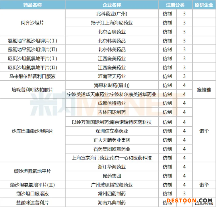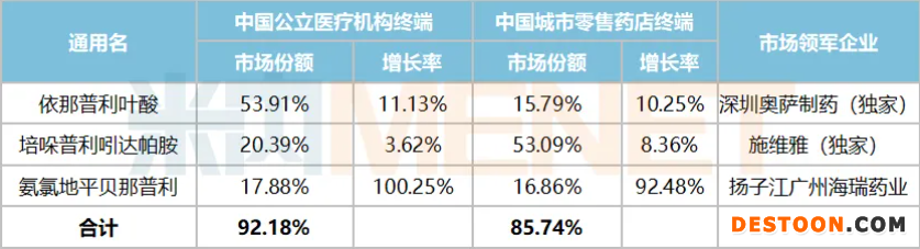 氨氯地平貝那普利目前獲批的國內藥企有揚子江以及成都地奧制藥集團,兩家企業(yè)的產品劑量不一樣,在中國公立醫(yī)療機構終端揚子江稱霸,在中國城市零售藥店終端則由成都地奧制藥集團領軍,但由于醫(yī)院終端銷售體量較大,整體而言揚子江仍處于領軍地位。
