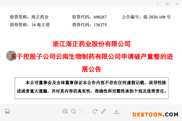 10月13日,海正藥業(yè)發(fā)布《關(guān)于控股子公司云南生物制藥有限公司申請破產(chǎn)重整的進展公告》。