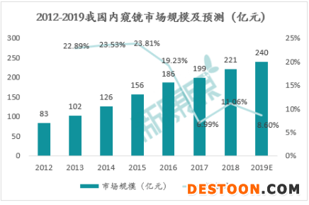我國內(nèi)窺鏡行業(yè)近年來穩(wěn)步發(fā)展,2012年?duì)I收83億元,到2018年已經(jīng)達(dá)到了221億元,預(yù)計(jì)到2019年會達(dá)到240億元。但增速有所放緩,2018年市場規(guī)模同比增長11.06%,小于在2016年前超過20%的增速。