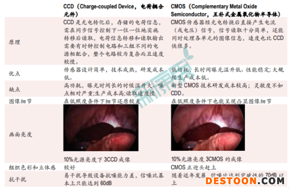 電子內(nèi)窺鏡的核心技術(shù)為圖像采集方式技術(shù),其中圖像傳感器的應(yīng)用則是影像呈現(xiàn)的技術(shù)核心。目前有CCD(電荷耦合元件)和 CMOS(互補(bǔ)式金屬氧化物半導(dǎo)體)兩種技術(shù),CCD技術(shù)由于影像質(zhì)量更好,在電子內(nèi)窺鏡發(fā)展初期被廣泛應(yīng)用,然而,隨著CMOS在色彩性能方面的提升,影像質(zhì)量以及與CCD差距越來越小,而其低耗能、噪聲小的特點(diǎn)為企業(yè)所欣賞,CCD向CMOS的轉(zhuǎn)變將是未來一段時(shí)間的發(fā)展趨勢。