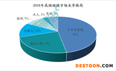 我國硬鏡市場目前主要被日企和德企瓜分。2018年硬鏡市場前五名中只有沈陽沈大一家內(nèi)資企業(yè),市場占比僅為3%,整體國產(chǎn)企業(yè)市場規(guī)模占比不到10%。其中,德企卡爾史密斯占據(jù)了行業(yè)的半壁江山,有47%的市場份額,日企奧林巴斯緊隨其后,占據(jù)23%的市場。