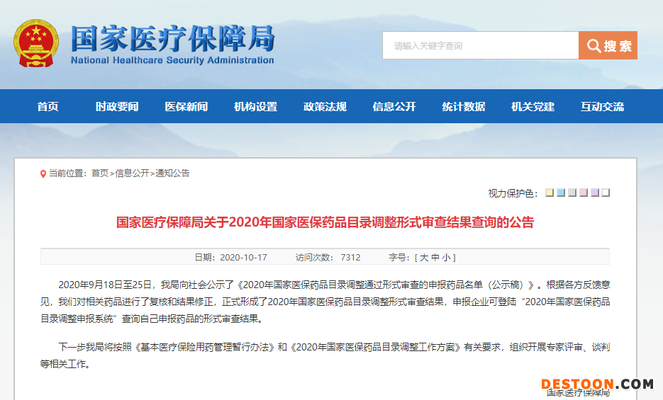 10月19日訊 10月17日,周六,醫(yī)保局沒有休息。醫(yī)保局官網(wǎng)發(fā)布《關于2020年國家醫(yī)保藥品目錄調(diào)整形式審查結(jié)果查詢的公告》。