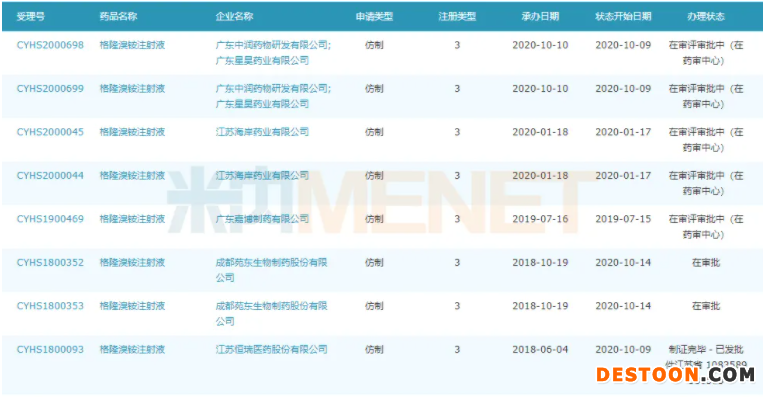 2020年10月10日,恒瑞發(fā)布公告稱(chēng),公司的格隆溴銨注射液獲批上市,為該產(chǎn)品“首仿+首家過(guò)評(píng)”企業(yè),目前成都苑東生物的3類(lèi)仿制上市申請(qǐng)也進(jìn)入了“在審批”狀態(tài),此外,廣東嘉博制藥、廣東中潤(rùn)藥物研發(fā)|廣東星昊藥業(yè)的上市申請(qǐng)均在審評(píng)審批中,江蘇海岸藥業(yè)的上市申請(qǐng)已獲批臨床。