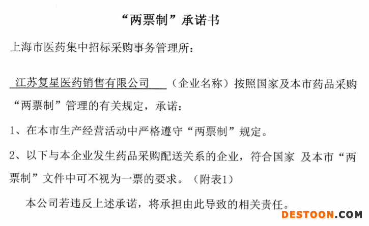 此外,10月16日,上海陽光采購醫(yī)藥網(wǎng)也發(fā)布消息顯示,38家醫(yī)藥流通或生產(chǎn)企業(yè)簽署“兩票制”承諾書,以江蘇復(fù)星醫(yī)藥銷售有限公司的承諾書為例,要求在本市生產(chǎn)經(jīng)營活動(dòng)中嚴(yán)格遵守兩票制規(guī)定。