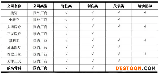 威高骨科是國內(nèi)產(chǎn)品線最齊全的公司,產(chǎn)品覆蓋了創(chuàng)傷、脊柱和關(guān)節(jié)等多個(gè)品類,且均有較強(qiáng)的競(jìng)爭(zhēng)力。