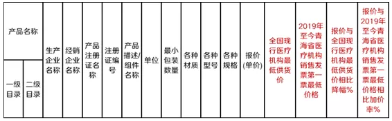 第二輪談判組根據(jù)申報(bào)企業(yè)的報(bào)價(jià)并參考企業(yè)提供的2019年至今青海省醫(yī)療機(jī)構(gòu)銷售發(fā)票第一票最低價(jià)格、全國現(xiàn)行醫(yī)療機(jī)構(gòu)最低供貨價(jià)進(jìn)行談判,議定的價(jià)格除以企業(yè)報(bào)價(jià)形成降幅,最后根據(jù)企業(yè)申報(bào)產(chǎn)品的平均降幅情況進(jìn)行排序,從高到低確定入圍廠家(品牌),國產(chǎn)企業(yè)入圍3家,進(jìn)口企業(yè)入圍3家。“申報(bào)產(chǎn)品報(bào)價(jià)表”中企業(yè)需要填寫的信息如下所示: