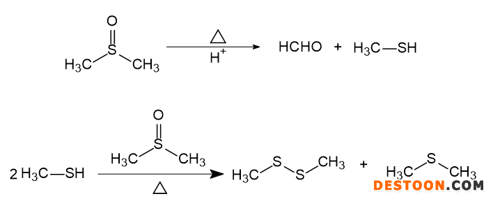 查詢二甲基亞砜穩(wěn)定性相關(guān)文獻(xiàn),報(bào)道二甲基亞砜在酸性條件下高溫加熱會發(fā)生分解,分解產(chǎn)物主要是甲硫醚(沸點(diǎn)38℃)、二甲基二硫醚(沸點(diǎn)109℃)和甲硫醇(沸點(diǎn)123℃)。