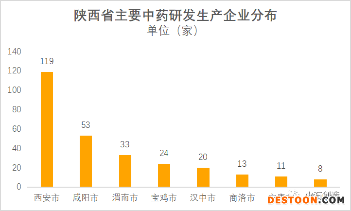 中藥工業(yè)方面,陜西省擁有中藥研發(fā)、生產(chǎn)企業(yè)281家,主要集中在西安市、咸陽市和渭南市。