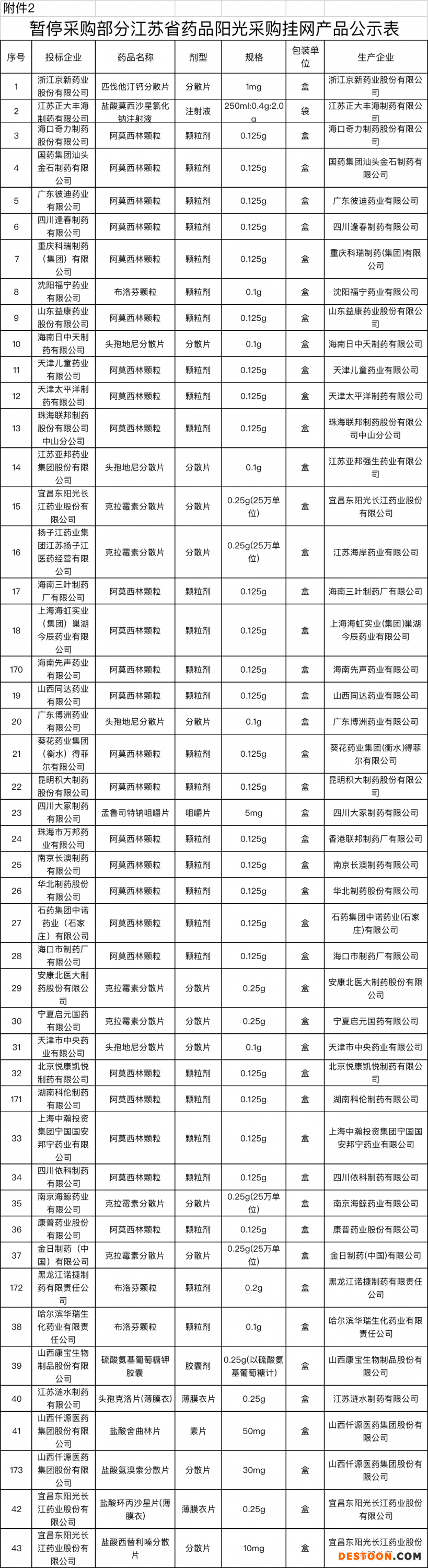 與此同時(shí),文件也附上了《暫停采購(gòu)部分江蘇省藥品陽(yáng)光采購(gòu)掛網(wǎng)產(chǎn)品》的公示表,共有186個(gè)藥被暫停采購(gòu)。