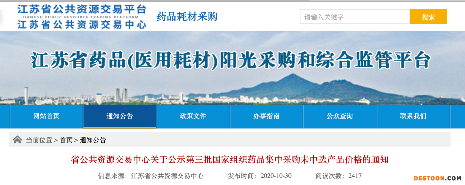 10月31日,江蘇省藥品陽(yáng)光采購(gòu)和綜合監(jiān)管平臺(tái)公布《第三批國(guó)家組織藥品集中采購(gòu)未中選產(chǎn)品價(jià)格的通知》。