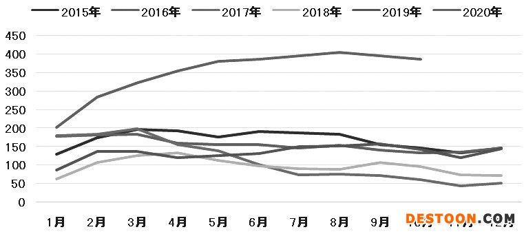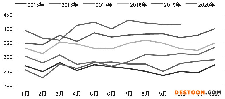 10月,由于國內(nèi)裝置檢修增多,使得PTA裝置開工較前期高位明顯下降,PTA供給也因此有所下滑,不過新鳳鳴2期投產(chǎn)了其中一條線110萬噸/年產(chǎn)能裝置,一定程度上彌補(bǔ)了裝置檢修所損失的產(chǎn)能,因此近期國內(nèi)PTA社會(huì)庫存雖連續(xù)去庫,但幅度相對(duì)較為有限。隨著近期多套裝置重啟復(fù)產(chǎn),PTA供給將有所增加,而需求卻難有進(jìn)一步提升,PTA社會(huì)庫存恐將再度累庫,庫存壓力仍然較大。截至10月末,國內(nèi)PTA社會(huì)庫存為386.97萬噸,環(huán)比9月末減少8.03萬噸,較2019年同期大幅增加244.97萬噸。