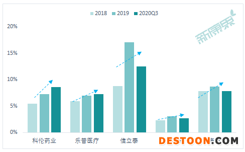 對(duì)比這五家企業(yè)的銷售費(fèi)用及研發(fā)費(fèi)用各自營(yíng)收占比情況,銷售費(fèi)用下降的同時(shí),研發(fā)費(fèi)用占比在逐步提升。一方面,帶量采購砍掉了中間帶金銷售環(huán)節(jié),節(jié)省了其中的銷售費(fèi)用,企業(yè)有更多的錢投入到研發(fā)里去,另一更重要方面,仿制藥納入帶量采購導(dǎo)致利潤(rùn)率降低,倒逼企業(yè)走向創(chuàng)新道路。