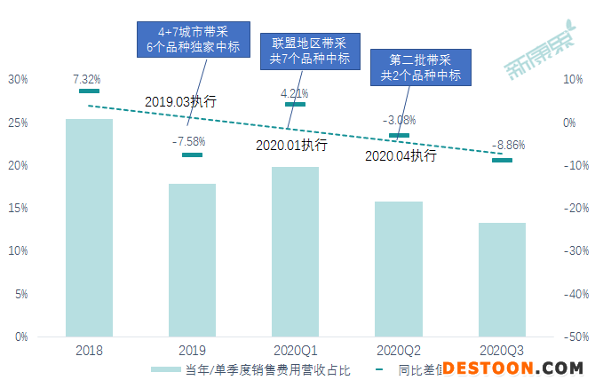 2018年11月,國(guó)家組織醫(yī)藥集中采購,以承諾的采購量換取降價(jià),在4+7城市試行,俗稱4+7城市帶量采購,隨后的2019年及2020年密集組織了聯(lián)盟地區(qū)、第二批及第三批帶量采購。帶量采購直接連接了制藥企業(yè)和醫(yī)院端,將中標(biāo)價(jià)格透明化,意在砍掉二者間的利益鏈條。從帶量采購政策推行方式來看,帶金銷售模式有望成為過去式。值得注意的是,化學(xué)制藥行業(yè)銷售費(fèi)用營(yíng)收占比2020年前三季度下降了3.6%,自2015年以來,銷售費(fèi)用占比首次出現(xiàn)下降。