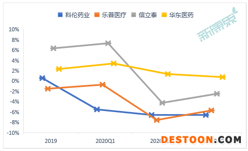 除華海藥業(yè)外,科倫藥業(yè)、樂普醫(yī)療、信立泰以及華東醫(yī)藥4家?guī)Я坎少徶匾獏⑴c者,其銷售費(fèi)用自2020年一季度開始呈明顯下降趨勢(shì),帶量采購政策砍“金”能力可謂強(qiáng)。