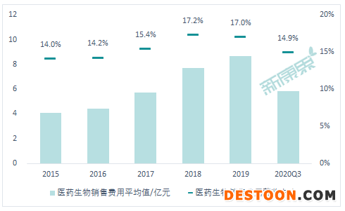 按照申萬行業(yè)分類,A股醫(yī)藥生物板塊上市公司共有352家。2020年前三季度,這352家藥企共實(shí)現(xiàn)營(yíng)業(yè)收入13300億元,其中有1981億元花在了銷售費(fèi)用上,占營(yíng)業(yè)收入比例為14.9%。