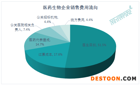 據(jù)恒大研究院調(diào)研數(shù)據(jù)顯示,醫(yī)藥生物企業(yè)的銷售費(fèi)用主要有六大流向:公關(guān)招標(biāo)機(jī)構(gòu)費(fèi)用、公關(guān)醫(yī)院相關(guān)負(fù)責(zé)人費(fèi)用、醫(yī)生回扣、醫(yī)藥代表提成、過票成本和統(tǒng)方費(fèi)用。其中,僅醫(yī)生回扣占比就超一半。根據(jù)國(guó)內(nèi)醫(yī)藥龍頭恒瑞醫(yī)藥財(cái)報(bào)數(shù)據(jù)顯示,近90%的銷售費(fèi)用為市場(chǎng)推廣等費(fèi)用。醫(yī)藥生物行業(yè)的銷售費(fèi)用,都用在了關(guān)系維護(hù)和市場(chǎng)推廣上,也即 “帶金銷售”。