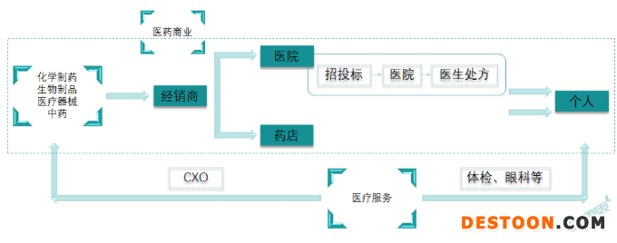 醫(yī)藥生物分類下有6個(gè)II級(jí)子行業(yè):化學(xué)制藥、生物制品、醫(yī)療器械、中藥、醫(yī)藥商業(yè)和醫(yī)療服務(wù)。其中化學(xué)制藥、生物制品、中藥和醫(yī)療器械子行業(yè)下的制造企業(yè)為屬于行業(yè)上游,其生產(chǎn)的藥品、器械等產(chǎn)品通過經(jīng)銷商銷售到藥店和醫(yī)院,由于醫(yī)院渠道的特殊性,繼而出現(xiàn)了帶金銷售。上游企業(yè)的產(chǎn)品需要經(jīng)過招投標(biāo)流程進(jìn)入醫(yī)院,再經(jīng)由醫(yī)生處方流到終端患者,雖然支付方為終端患者個(gè)人及醫(yī)保,但是處方的決定權(quán)在醫(yī)生。這一決定權(quán)帶來了灰色的回扣費(fèi)用,也是上游制藥企業(yè)的銷售費(fèi)用主要流向。