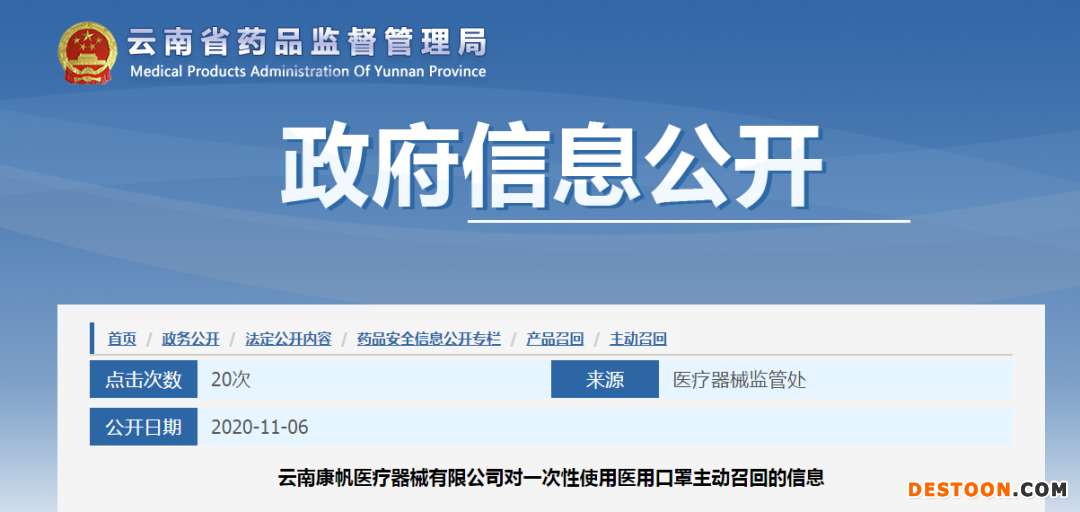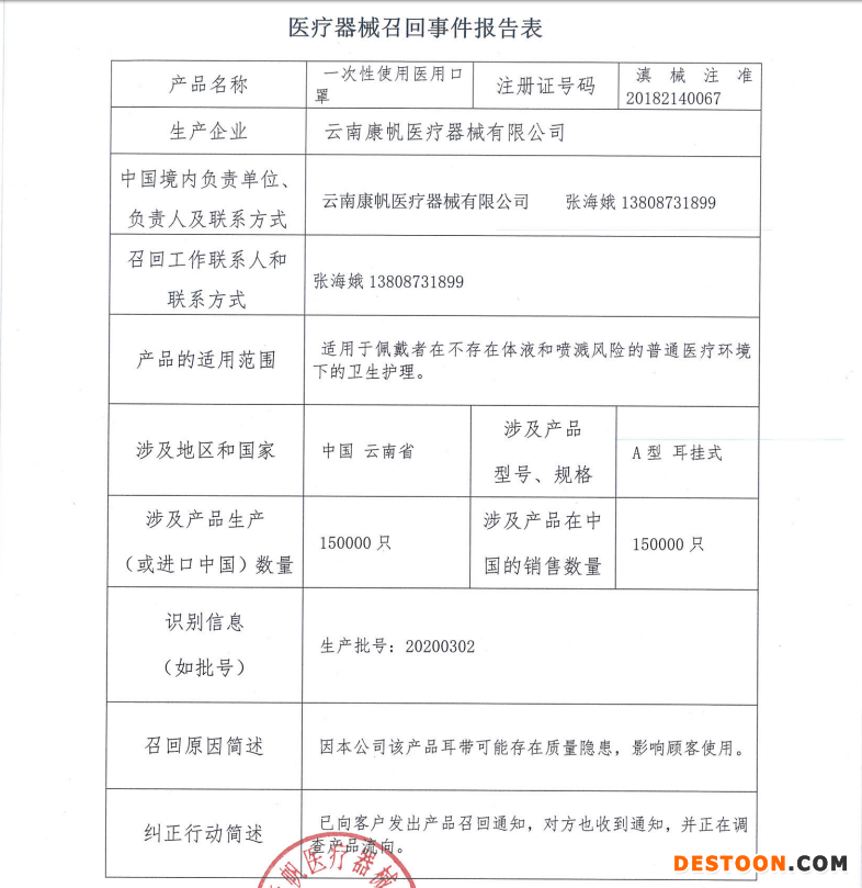 故云南康帆醫(yī)療器械有限公司對其生產(chǎn)的一次性使用醫(yī)用口罩(批號:20200302)主動召回,此次共計召回口罩150000只,召回級別為三級。