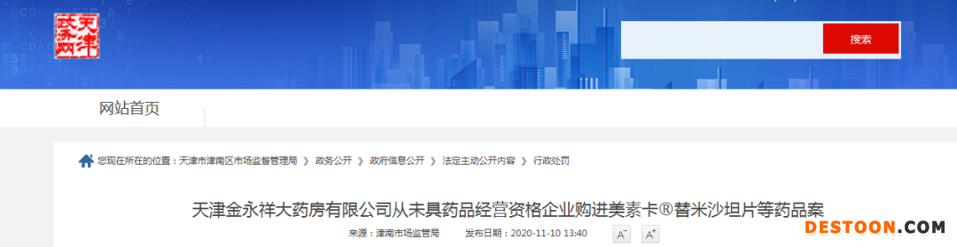 通過處決書顯示,天津金永祥大藥房有限公司于2020年5月從無藥品經(jīng)營(yíng)資質(zhì)人員處購買美素卡®替米沙坦片(國(guó)藥準(zhǔn)字J20180016)等藥品,并在所開的網(wǎng)店銷售。其中2020年5月21日至2020年7月22日銷售該藥品58筆,銷售金額為8562.76元。