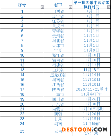 另外,據(jù)賽柏藍(lán)梳理,截至11月16日,共25個(gè)省市明確了執(zhí)行第三批國采結(jié)果的時(shí)間——其中8省市均于11月1日起執(zhí)行,分別是遼寧、江蘇、山西、青海、貴州、重慶、河北、天津。
