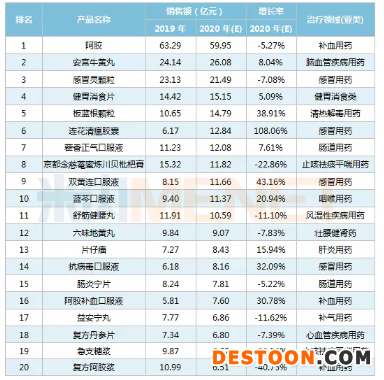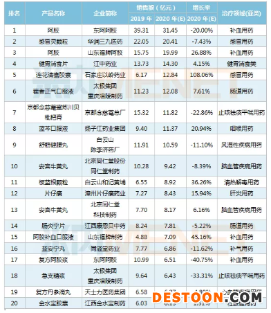 中成藥廠家TOP20中,東膠阿膠的領(lǐng)軍地位依然難以撼動,華潤三九醫(yī)藥、太極集團重慶涪陵制藥、云南白藥集團、山東福牌阿膠均位列TOP5,銷售額均超過20億元。山東福牌阿膠、石家莊以嶺藥業(yè)、揚子江藥業(yè)集團3家藥企的銷售額增長強勁。