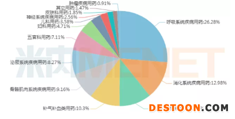 從中成藥大類格局來看,呼吸系統(tǒng)疾病用藥是零售藥店最暢銷的品類,占據(jù)26.28%的市場份額,消化系統(tǒng)疾病用藥、心腦血管疾病用藥、補氣補血類用藥則分別位列第二、第三、第四,市場份額均超過10%。