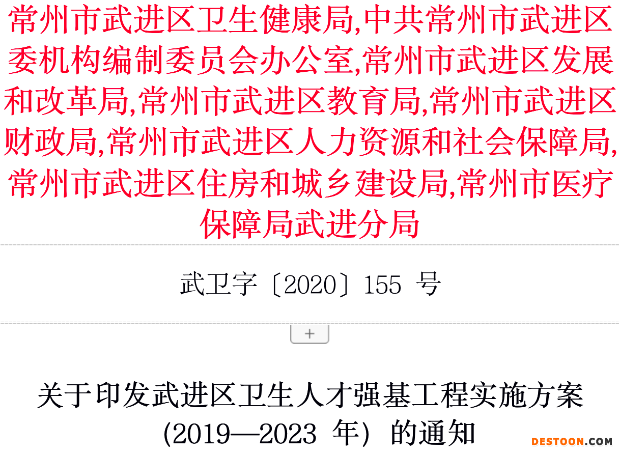近日,江蘇省常州市武進(jìn)區(qū)衛(wèi)健局、編制委員會(huì)辦公室等八部門聯(lián)合發(fā)布《關(guān)于印發(fā)武進(jìn)區(qū)衛(wèi)生人才強(qiáng)基工程實(shí)施方案(2019—2023年)的通知》(以下簡(jiǎn)稱《通知》)。
