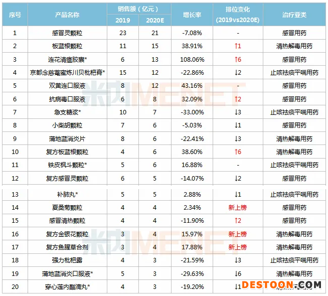 TOP20產(chǎn)品大洗牌,多個(gè)產(chǎn)品排位更替,連花清瘟膠囊、復(fù)方板藍(lán)根顆粒均上升6個(gè)位次,夏桑菊顆粒、復(fù)方金銀花顆粒、復(fù)方魚腥草合劑新上榜,川貝雪梨糖漿、肺寧顆粒、桑菊感冒顆粒銷售額下滑幅度均超過30%,退出TOP20產(chǎn)品。
