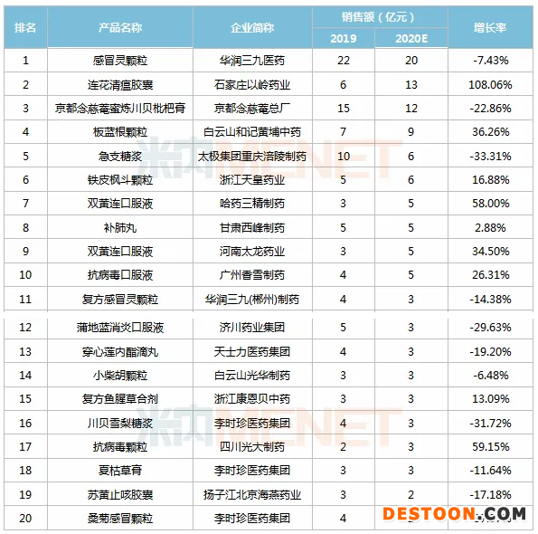 從增長率看,20個(gè)產(chǎn)品中有10個(gè)同比去年呈正增長,連花清瘟膠囊(感冒用藥)、板藍(lán)根顆粒(清熱解毒用藥)、雙黃連口服液(感冒用藥)、抗病毒口服液(感冒用藥)、復(fù)方板藍(lán)根顆粒(清熱解毒用藥)增速超過30%,其中連花清瘟膠囊大漲超100%。