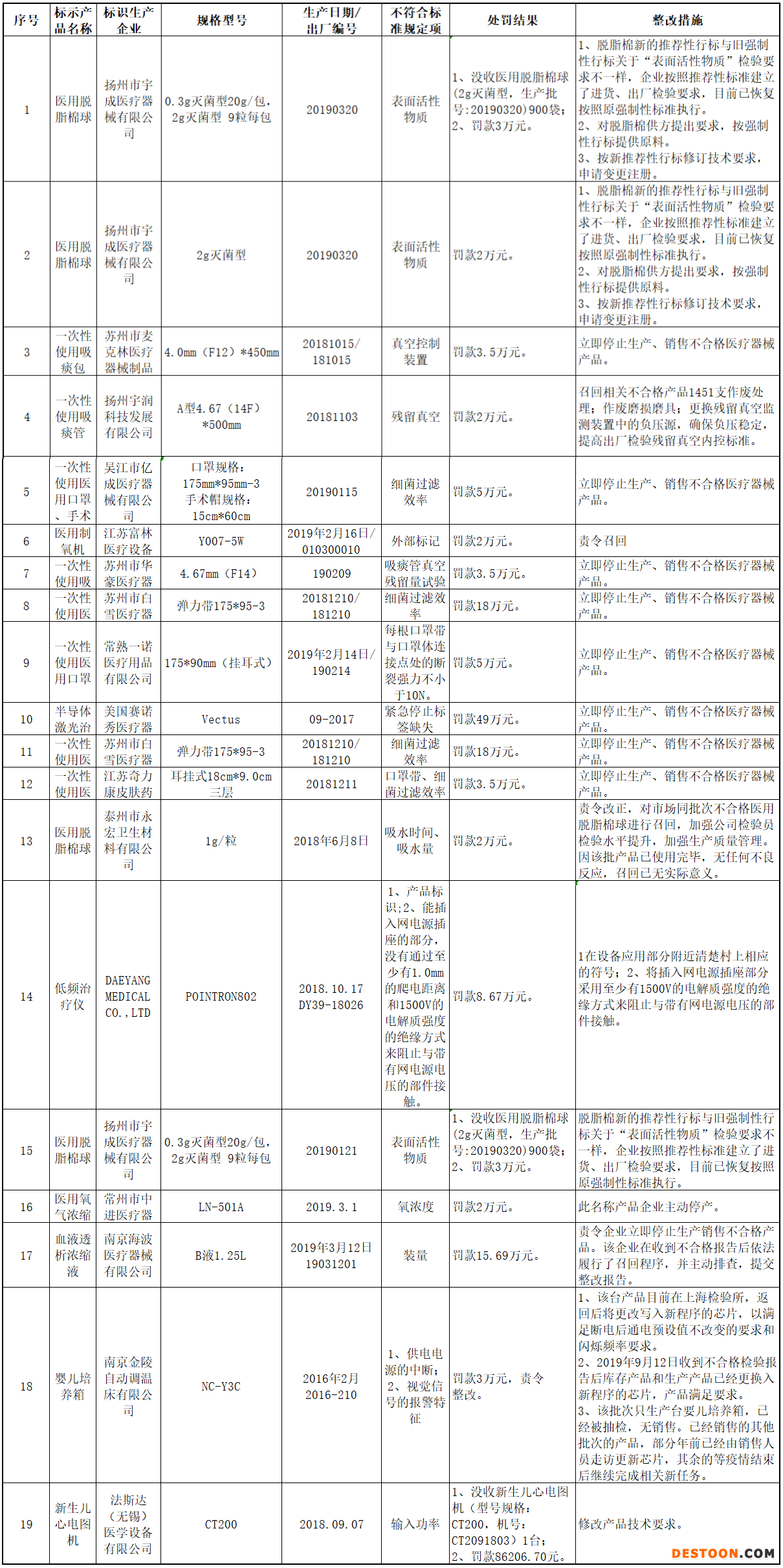 除了械企停產(chǎn),近期,江蘇省藥監(jiān)局還發(fā)布了《江蘇省醫(yī)療器械國抽通告(2019年第8號)處置情況匯總表》。