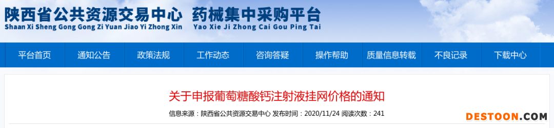 11月24日,陜西省公共資源交易中心發(fā)布《關(guān)于申報葡萄糖酸鈣注射液掛網(wǎng)價格的通知》。