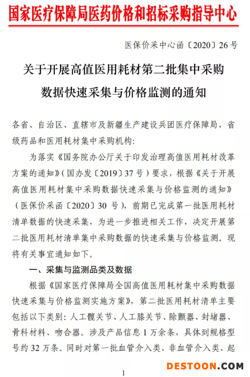 近日,據(jù)醫(yī)保局發(fā)布的《關(guān)于開展高值醫(yī)用耗材第二批集中采購數(shù)據(jù)快速采集與價格檢測的通知》,第二批耗材集采涉及的產(chǎn)品有以下幾類:人工髖關(guān)節(jié)、人工膝關(guān)節(jié)、除顫器、封堵器、骨科材料、吻合器六種高值耗材,共涉及產(chǎn)品信息1萬余條,具體到規(guī)格型號約32萬條。同時對第一批血管介入類、非血管介入類、起搏器類、眼科類產(chǎn)品進行增補。