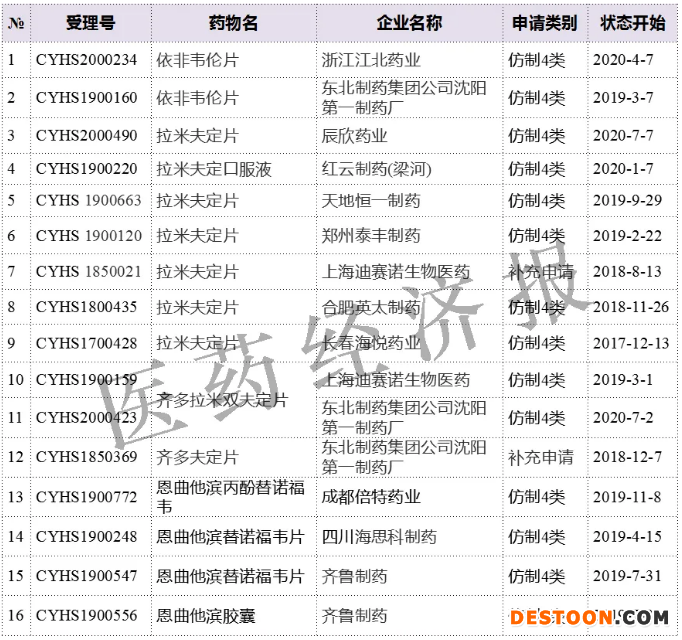 目前,還有許多廠商對(duì)替諾福韋二吡呋酯片仿制4類(lèi)進(jìn)入最后階段,北京百奧藥業(yè)、蘇州東瑞制藥、蘇州弘森藥業(yè)、深圳科興生物、重慶藥友制藥、山東新時(shí)代藥業(yè)、江西青峰藥業(yè)、湖南千金湘江藥業(yè)、白云山制藥總廠等9家的替諾福韋二吡呋酯片在審評(píng)審批中(在藥審中心)。
