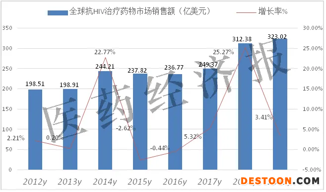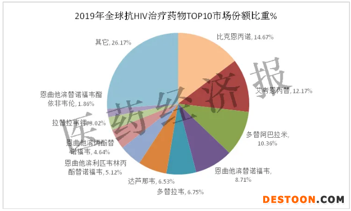 據(jù)跨國(guó)公司財(cái)報(bào),2019年全球抗HIV藥物終端市場(chǎng)為323億美元,同比上一年增長(zhǎng)率為3.41%。其中抗HIV藥物TOP10占據(jù)了該領(lǐng)域70%以上的市場(chǎng)。
