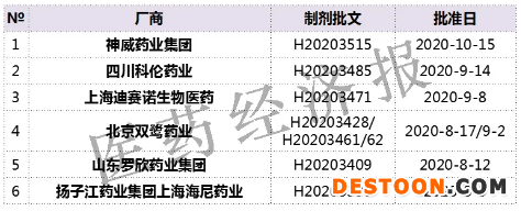 迄今NMPA批準(zhǔn)國(guó)內(nèi)17家企業(yè)的替諾福韋二吡呋酯片上市,并進(jìn)入中國(guó)上市藥品目錄集,通過(guò)一致性評(píng)價(jià)。2020年NMPA批準(zhǔn)生產(chǎn)替諾福韋二吡呋酯片的企業(yè)有神威藥業(yè)、四川科倫、上海迪賽諾、北京雙鷺、北京雙鷺和揚(yáng)子江上海海尼等6家,通過(guò)一致性評(píng)價(jià)。