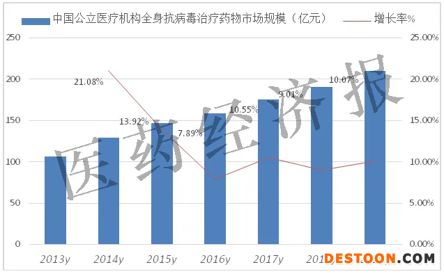 圖3 2013-2019年中國(guó)公立醫(yī)療機(jī)構(gòu)全身抗病毒藥物市場(chǎng)情況