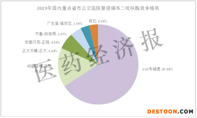 圖6 2019年國(guó)內(nèi)重點(diǎn)省市公立醫(yī)院替諾福韋二吡呋酯競(jìng)爭(zhēng)格局