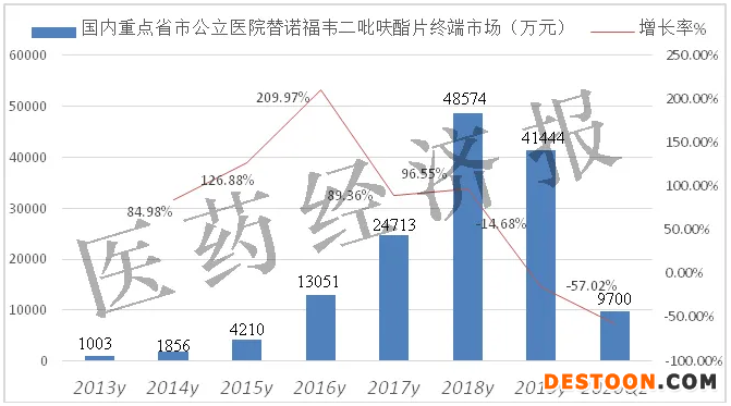 米內(nèi)網(wǎng)數(shù)據(jù)顯示,2018年國(guó)內(nèi)重點(diǎn)省市公立醫(yī)院替諾福韋二吡呋酯片市場(chǎng)近5億元,同比上一年增長(zhǎng)96.55%。替諾福韋二吡呋酯片也是此前“4+7”帶量采購(gòu)的品種,成都倍特藥業(yè)的替諾福韋二吡呋酯(TDF)片以低至每片不到0.6元的價(jià)格進(jìn)入首輪“4+7”帶量采購(gòu)。2020年上半年,受新冠狀疫情影響醫(yī)院門(mén)診銳減,替諾福韋二吡呋酯片市場(chǎng)直線下滑。